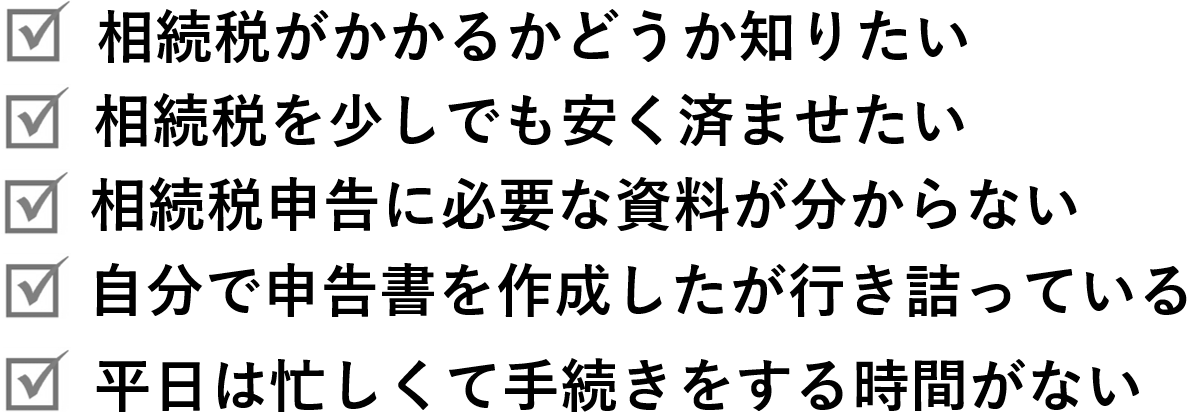 上記のようなお悩みをお持ちの方のお客様のために、当事務所では、相続税がかかるかどうかのシュミレーションや相続税申告の手続きについて詳しく説明致します!